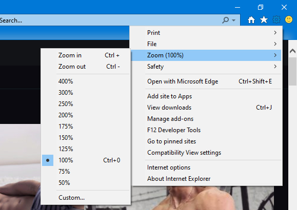 Under the "View" tab, highlight "Zoom", and select either "Zoom In" (Ctrl +) or "Zoom Out" (Ctrl -). To reset zoom settings, select "Actual Size" (Ctrl 0).